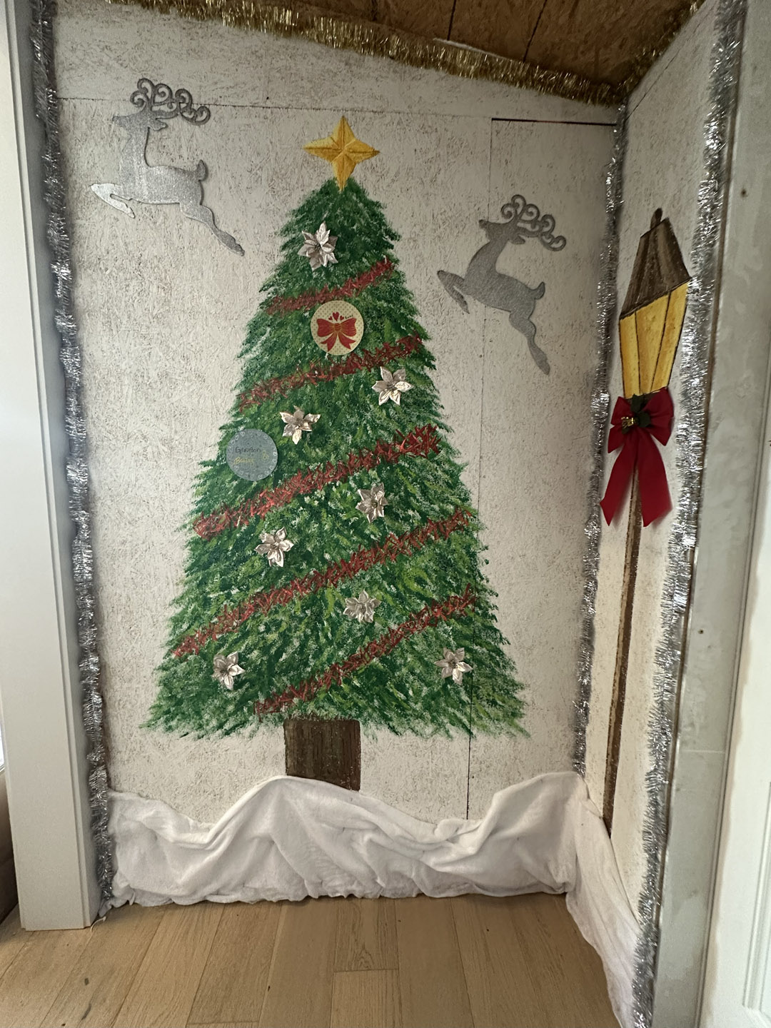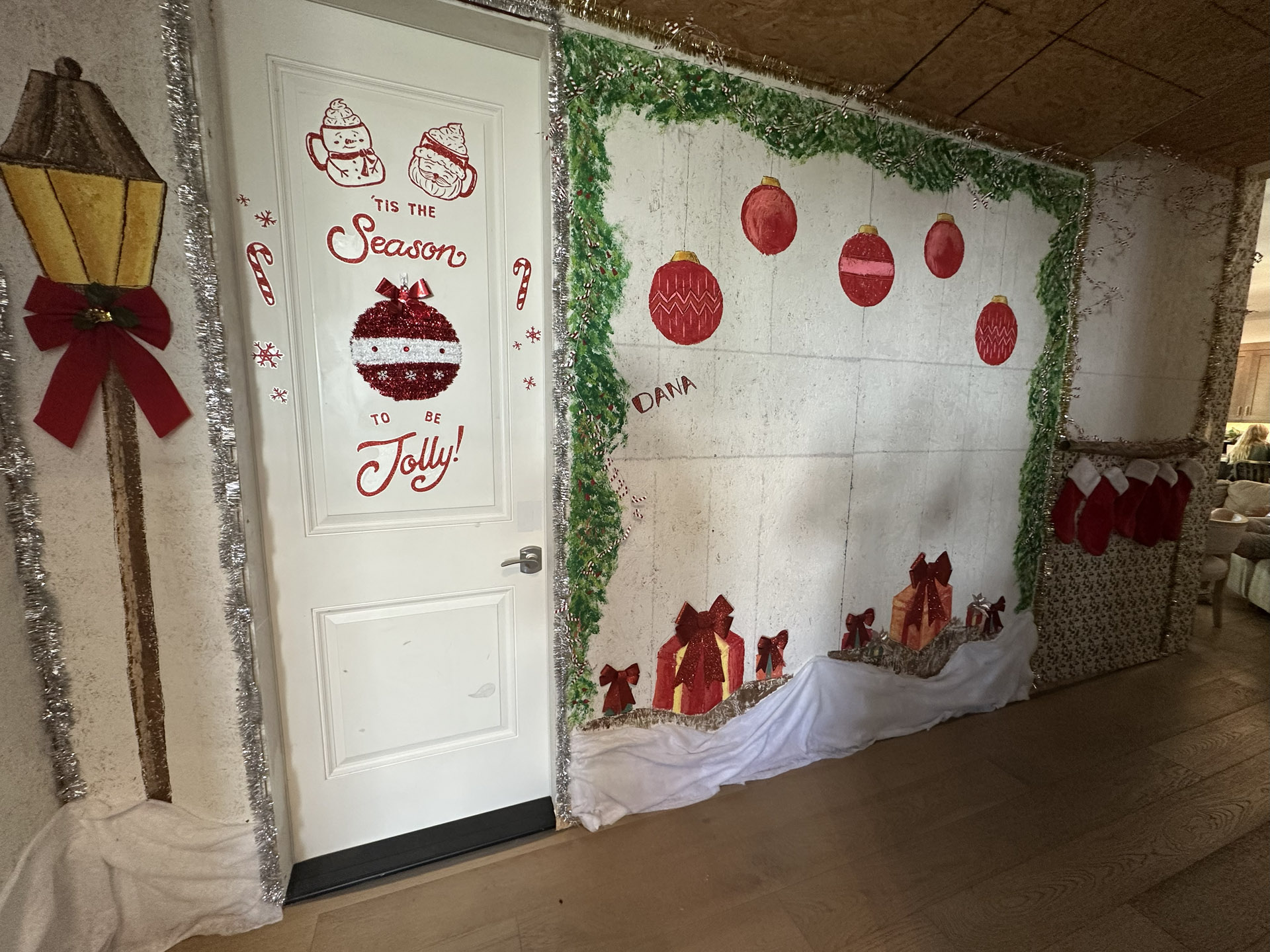 I painted a Christmas mural and created a communal space where anyone visiting can add an ornament or sign the wall. A few early ornaments have already appeared—including a “6-7,” which we have chosen not to question.